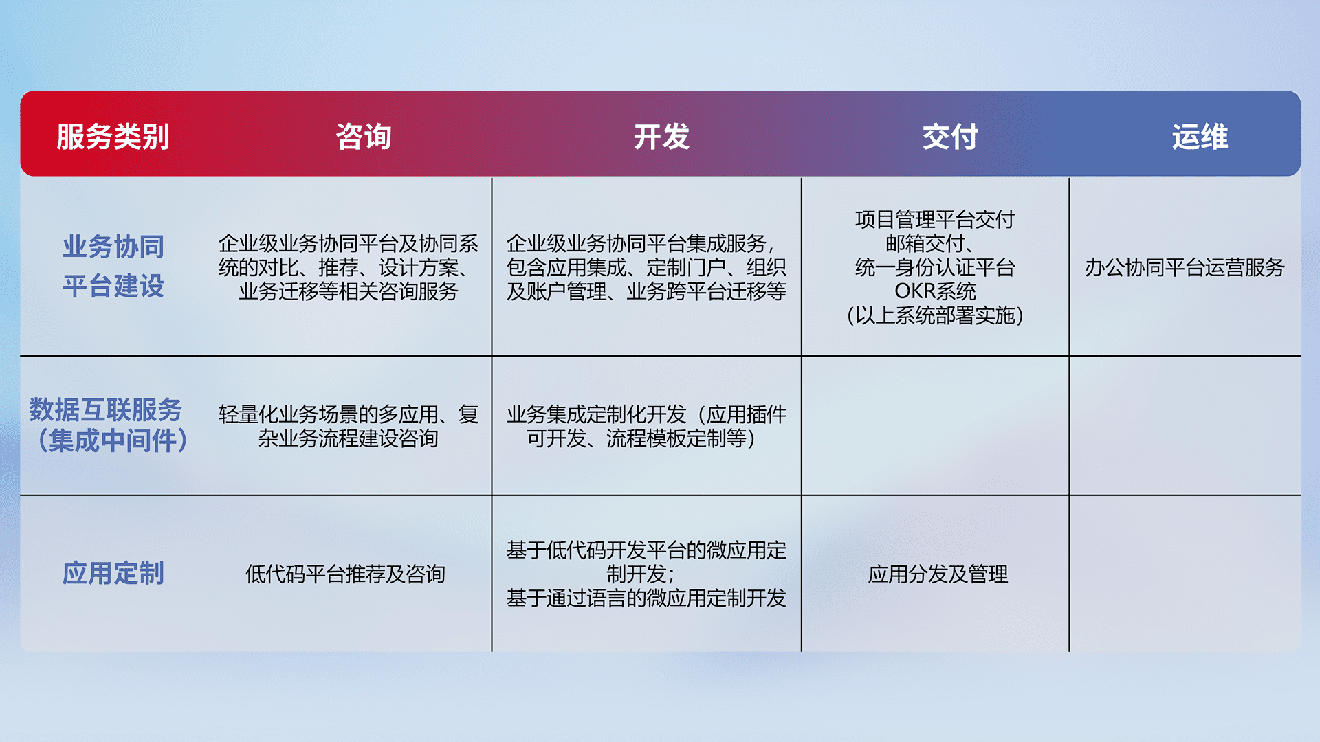 针对钉钉、、企微、、IDaas等平台级产品提供产品的规划、、、、方案、、、交付、、、定制化开发等服务,,,实现如统一协同办公、、、智能客户服务、、混合会议管理、、、智能数据查询、、等业务场景,,,,实现数字化转型。。。。